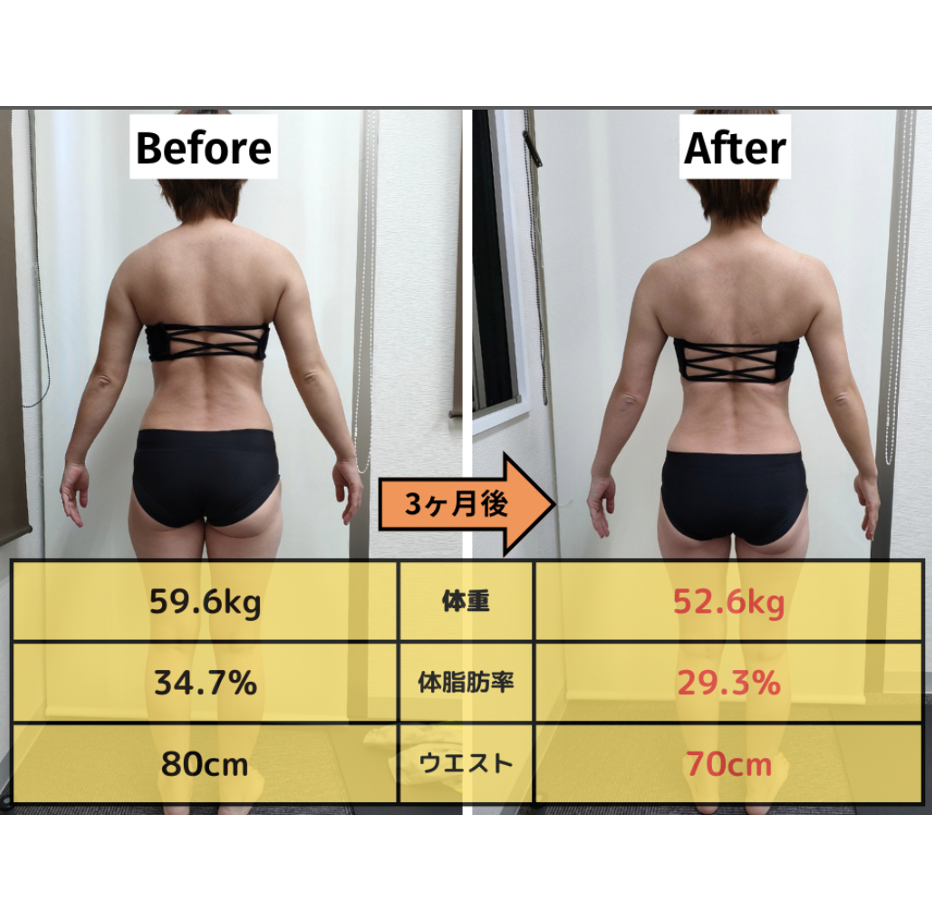 ※3ヶ月でのパーソナルトレーニングとお食事サポートでのダイエット成果になります。