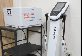 体の現状を把握するために、体組成測定器にて体重や体脂肪率などを計測します。